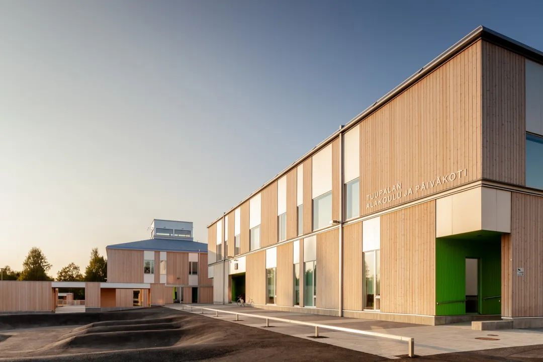Tuupala小学是芬兰第一栋使用CLT木构造建成的学校,其建筑立面上对应CLT面板的所在都设置了实杉木板,且两块实木板之间的空间采用氧化铝板和窗户进行填充,通过几种材料的组合形成了独特的韵律感。
