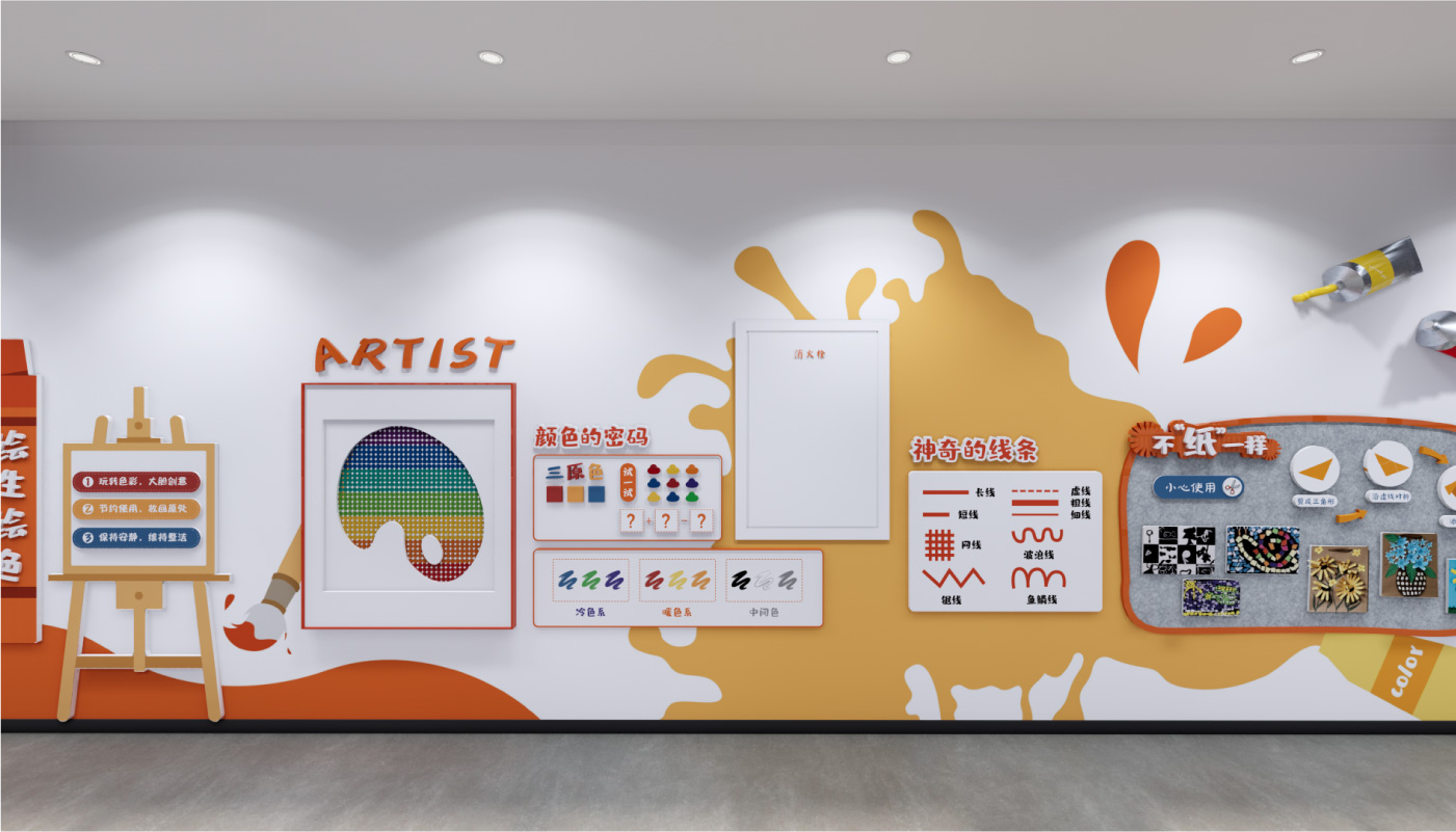 潜能文化从幼儿园“各美其美,美美与共”的特色文化出发,将其与美术教室、手工创意室、舞蹈室等多种不同风格的环境表达相结合,以富有童趣的插画语言和多样化呈现的互动设计,丰富了整体空间的文化可读性,让孩子们可以在观察、触摸、感受、 创造的探索过程中,不断完善自身对事物的认知,进而绽放出自身内在的潜能,共同点亮彩虹文化的光芒与色彩。